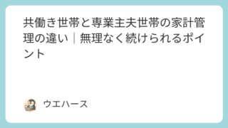家計管理 共働き世帯と専業主夫世帯の家計管理の違い|無理なく続けられるポイント はじめに家計管理は、家庭の形によって大きく変わります。夫婦で共に働いて収入を得る「共働き世帯」と片方が家事や育児を担う「専業主夫(主婦)世帯」では、お金の流れや考え方に違いがあるのは当然です。私自身、最近専業主夫になり、これまでとは違った視... 2025.09.22 家計管理